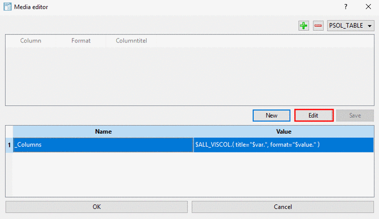 _Columnsand click on . If the variable does not exist yet, then create it as described under Section 10.6.1.1, “Create Media Variables”.-> The upper half of the dialog box is activated now (before it was grayed out) and the settings for Column (column display), Format (line formatting) and Title (title formatting) become visible.