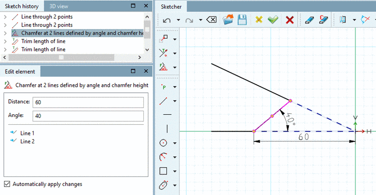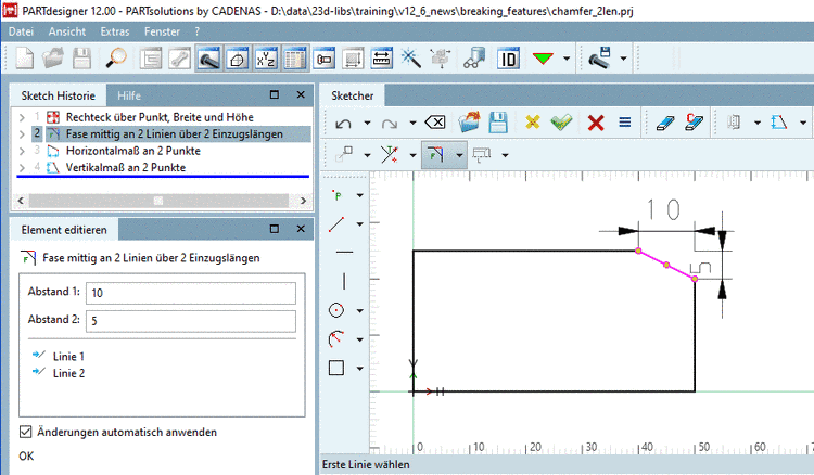 Chamfer between 2 lines, adjustable via angle on first selected line (counterclockwise) and length of chamfer.