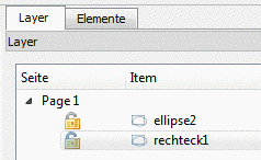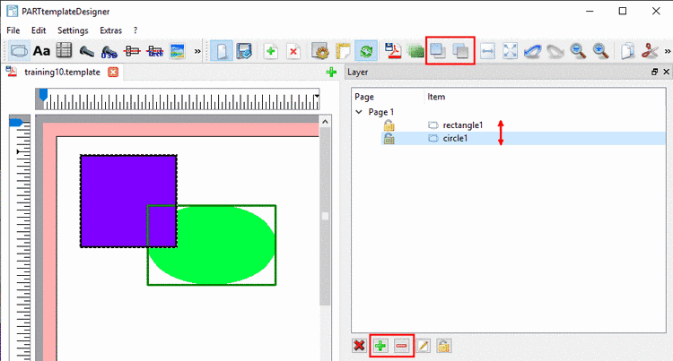 The level of the selected object can be moved to the front or to the back by clicking on the icons in the toolbar or on the plus-minus-icons on the Layer tabbed page. The higher the entry in the list on the tabbed page Layer, the more in the front the level of the object.