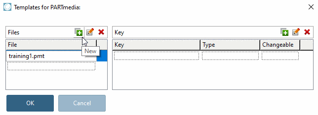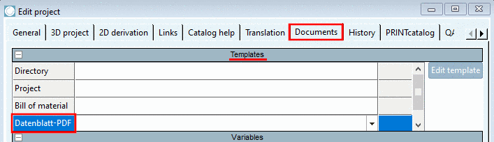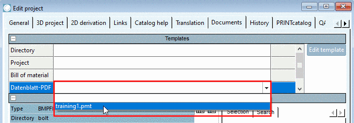 media.cfgshould be automatically created with the following content in the directory "_templates".[TMPLATETYPES] DIR=Verzeichnis PRJ=Projekt BOM=Stückliste PDF=Datenblatt-PDFOnce the entry "PDF=Datenblatt-PDF" exists, in PARTproject, in the section Templates, the entry Datenblatt-PDF (Datasheet PDF) is displayed.