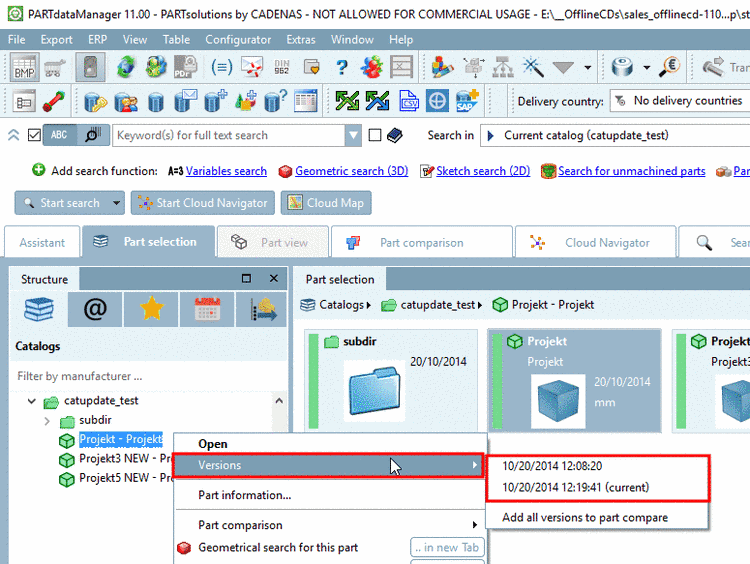 In the PARTdataManager the new version is displayed as current version. Versioned projects are no more displayed in the standard view. However, they can be called via context menu command Versions.