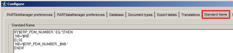 To define the Standard name and thus the CAD file name you can use IF conditions, Fortran syntax, constants and ERP variables (launch with '$Variablenname.') to create names: