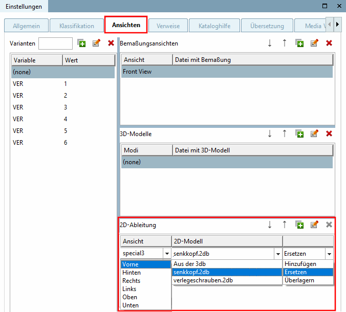 In the PARTdataManager simple standard views [Default views] such as front, back, top, etc. and standard combination [Combination views] views are automatically provided in the 2D derivation docking window. These are saved within the 3db file and are no longer visible in PARTproject are no longer visible.