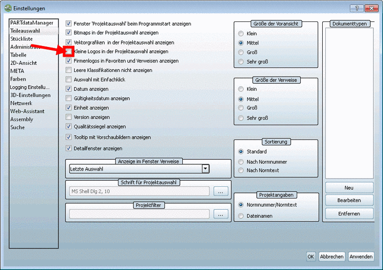In the PARTdataManager settings dialog box select the checkbox Show small logos in project selection for example.