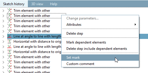 With an adjustable marking (blue line) in the Sketch history (initially at the bottom), you can return to each single design step which then is immediately displayed in the Sketcher.