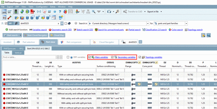 All variables are listed in the right column. In the input field at the bottom right, you can enter anything to filter the variables. [Input of any terms is possible. For example "diameter" will also find "outer diameter" and "inner diameter".
