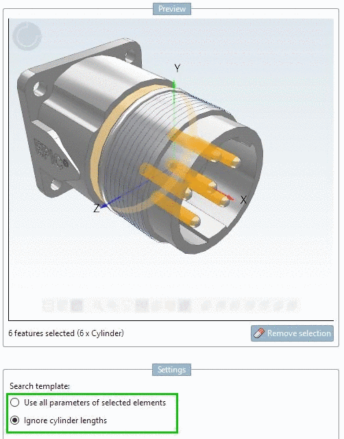 When searching a socket for a connector, you would mark the pins. But the length of the holes in the socket could be different. That's why, use the option Ignore cylinder lengths.
