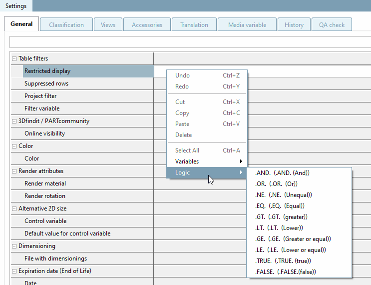 - Table restriction [Restricted display] and line suppression [Suppressed rows]: - These two function have a similar effect. - You may also use Fortran-Syntax. - Table restriction [Restricted display]: - For example, determine the condition D.EQ.8, in order to reduce the table display to specific values (see figure below).[34] - Line suppression [Suppressed rows]: e.g. D.EQ.8 for a number variable or D.EQ.'8' for a text variable. - With line suppression [Suppressed rows], only one variable without a value can also be specified (list field selection). In this case, all rows that have any value in this variable are displayed. ![[Note]](https://webapi.partcommunity.com/service/help/latest/pages/jp/ecatalogsolutions/doc/images/note.png) - Note - Table restriction [Restricted display] and row suppression [Suppressed rows] can be better implemented with the Strategic Parts Management methods if ERP functionality is available (see e.g. Section 4.7.4.1.4, “ Display condition for table rows - plinkgroups.cfg -> Block [Role_name] -> Key "TABRESTRICTION" ” in ENTERPRISE 3Dfindit (Professional) - Administration). - The limitations of table restriction [Restricted display] and Line suppression [Suppressed rows] is fixed - in contrast to the preferred row function  , which can be switched on and on
