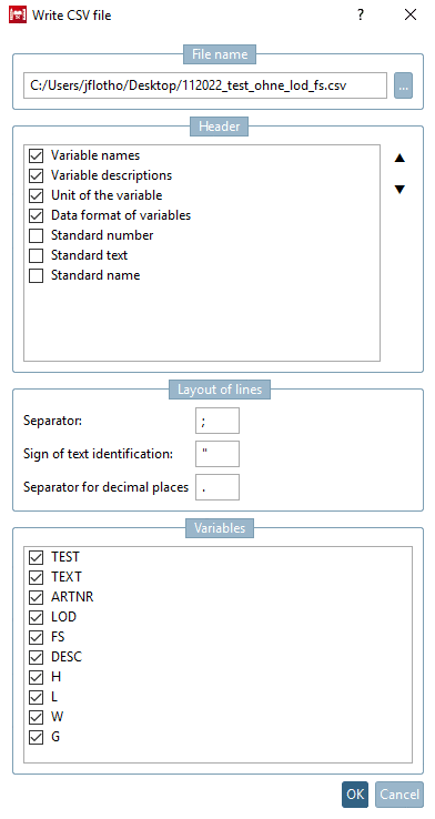 When omitting the Variables „LOD“ and „FS“ (no checkmark), the CSV file is reduced accordingly.