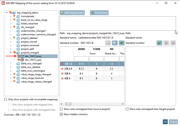 -> Once selecting a row in the left table, on the right, the correct target project is shown.