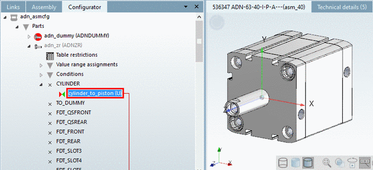 Switch into the configuration mode in PARTdataManager and check which rule is the connection between the moveable parts – e.g. cylinder and piston. Open the rule then.