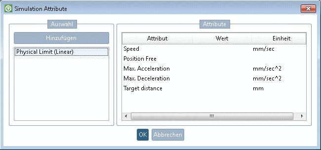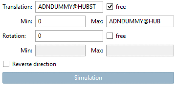 In the dialog area Positioning, the checkbox Translation „free“ must be activated and the Min. and Max. values must be specified according to the physical limits of the “real” product. (In the example in hand it's about a Translation movement of the piston.)