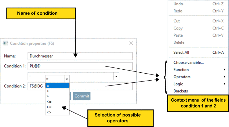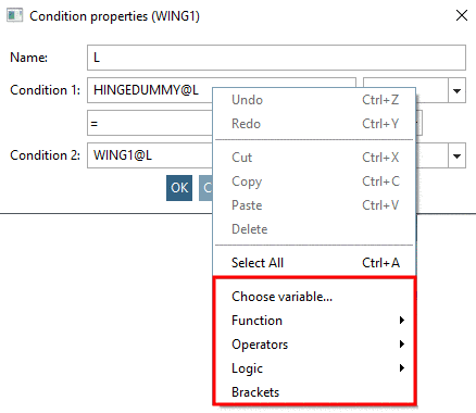 In the fields Condition 1 and Condition 2 you cannot enter only manually but also set formula- and variable names. The context menu, called by secondary mouse key, provides extensive opportunities to define conditions: