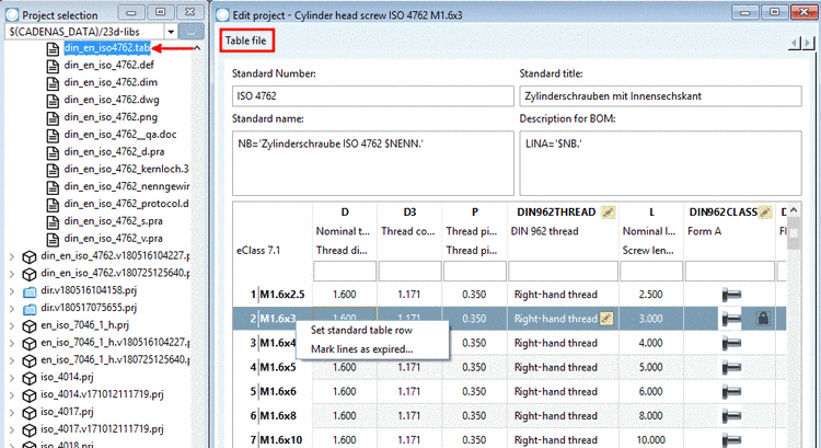 Once selecting a *.tac or *.tab file under Project selection in the index tree, on the right, under Edit project, the tabbed page Table file is displayed.