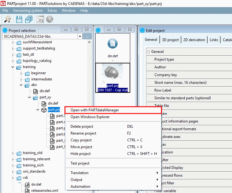 Click the context menu command Open with PARTdataManager.