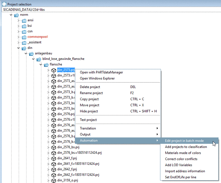 Choose the Automation -> Edit project in batch mode command in the context menu which opens.