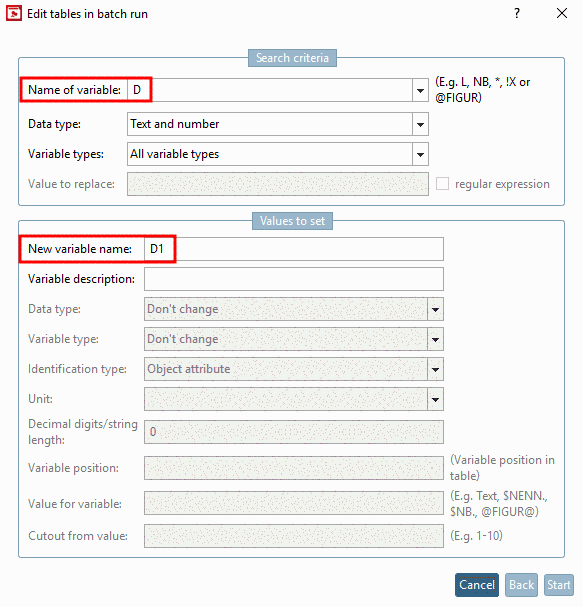 In order to rename variables, it does not suffice simply to change the name only in the table. The corresponding change must also be made in the geometry. | |