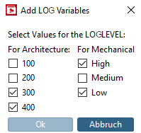 In Architecture / BIM catalogs the subject LOG has special importance. In parallel to the stages High / Medium / Low known from the „Mechanical“ field, here, a separate schema in the form of 100 / 200 / 300 / 400 is used.
