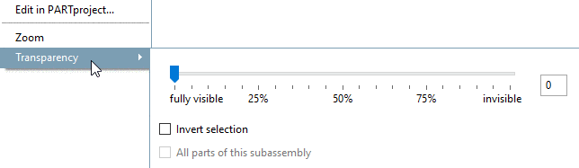 Transparency: With this option you can hide and show certain parts in assemblies temporarily in order to gain better overview.