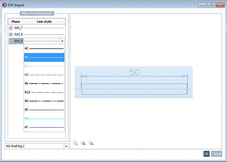 -> The dialog box DXF import is displayed with the chosen DWG/DXF view.