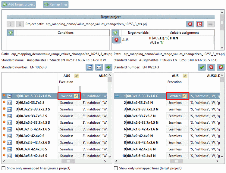 4. Now when performing changes for the variable AUS, they are automatically displayed in the right table.