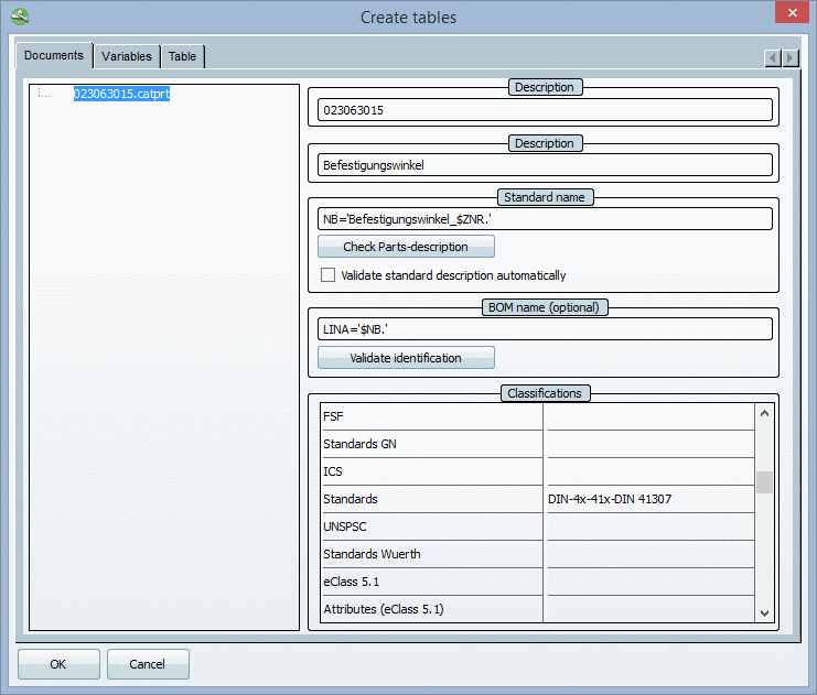 Dialog box Create tables - tabbed page Documents