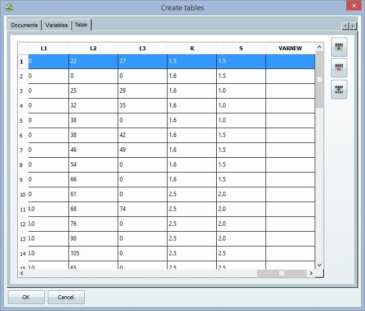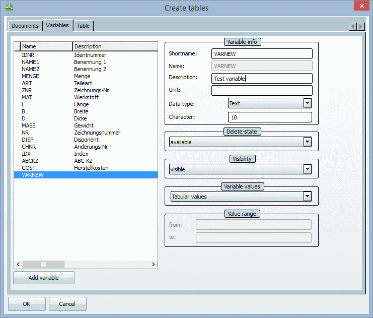 Dialog box Create tables - tabbed page Variables