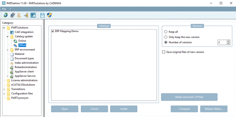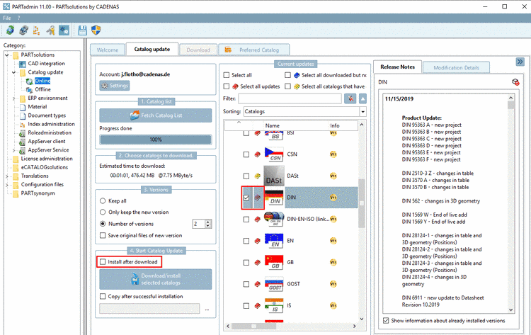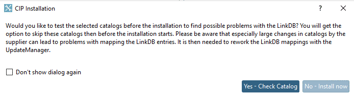 If after the check the installation shall be performed, at desired catalogs, activate the checkbox and click on otherwise on .