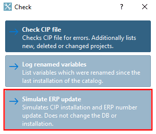 If datasets with status to check or not mapped are found during a test run, in the dialog box CIP Installation the tabs Protocol, ERP Status and PLM Status are displayed, otherwise the installation is immediately performed.