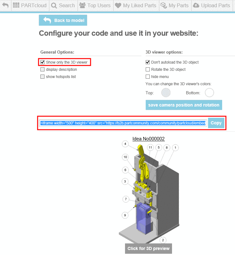 route=part&name=Idea+No000002&model_id=67101The page "Configure your code and use it in your website" is opened.