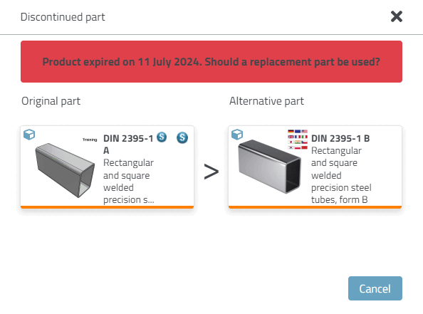 Icons and dialogs indicate whether a part can be used and whether alternative parts are available.
