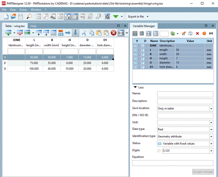 -> PARTdesigner is opened with the docking windows Table and Variable Manager.