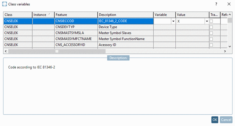 3. Under Class CNSELEK -> Attribute CNSIECCOD (Description IEC_81346_2_CODE), set the respective value.