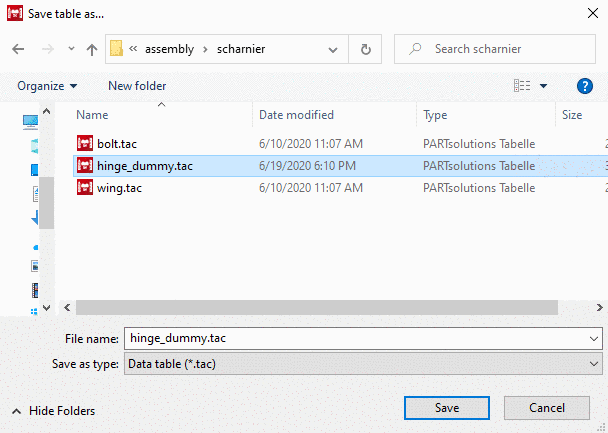 -> PARTdesigner is opened. Save the file as "hinge_dummy.tab or .tac". (Confirm with "Yes" - if the query pops up - "Replace?").
