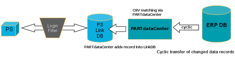 The datasets are exported at a certain point of time as CSV file - preferably during the night - and then identified by PARTdataCenter and read in the LinkDB.