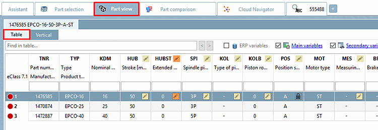 In the following the various functions in the table view are explained: