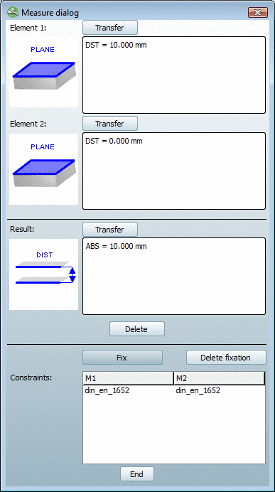 Der Measure dialog gliedert sich in die Felder Element 1, Element 2 und Result und Constraints.