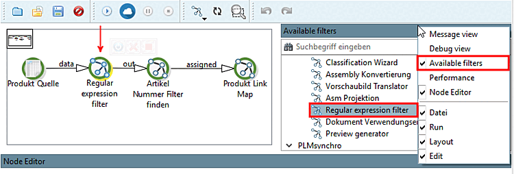 Drag & drop the filter onto the edge between the product source [Product Source] and item number Find filter [Find Article Number].