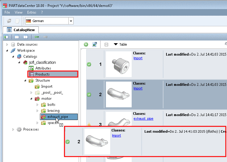 In the following example, products have been imported into the class "Import" before (see Section 1.3.6.3.1, “ Import from CAD ”) and now these shall be moved in the proper classes below the class "motor".