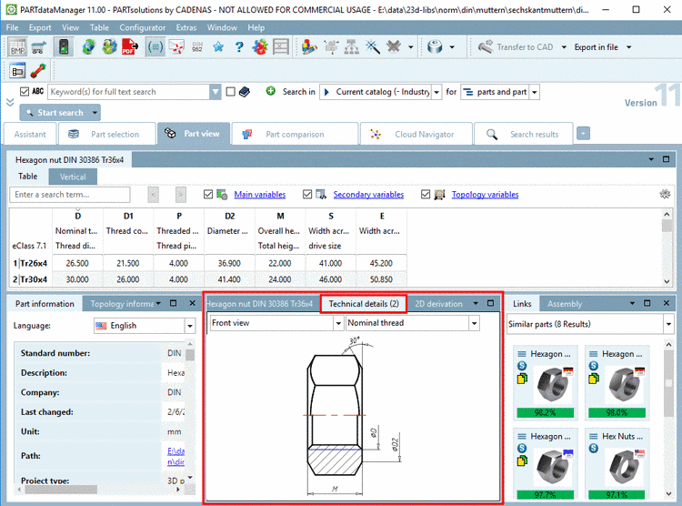 For many users (e.g. of ERP systems, etc.) the part’s weight information is very important, because they need to calculate storage weights or cost for transportation. We can manage the weight as attribute in the catalog and also transfer it to many target systems. Please tell your CADENAS contact person, if you can supply these values. We will add them in the catalog. Also see Section 5.9.2.3, “ Menu item Variables ” -> (Variable with mass, material, density).