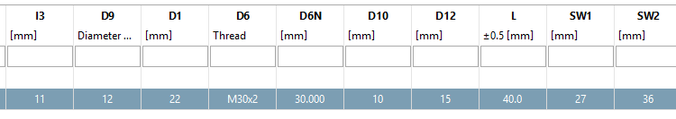 Dimension Tables have to be provided in CSV/XLS format, so the contents can be usually transferred without losses into the CADENAS system. The contractor can also declare the variable names, variable descriptions, variable units and the content of selection fields this way. The table has to declare all the geometrical variants, help dimensions and technical details that are required for the construction of the parts. See Section 7.12.17, “ Import CSV file ”.