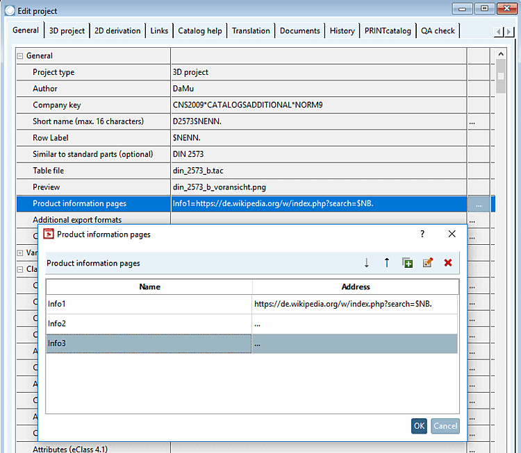 Under product information pages [Product information pages], the catalog manufacturer can provide project-specific additional information (e.g. installation instructions, store information, etc.) in HTML form for their catalog. These can link to an external website or be located in a directory within the project directory. Variables can be used. The syntax is the same as for document variables.