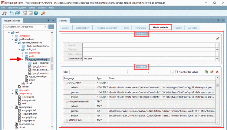 The following explains how to create Media Variables in PARTproject. Alternatively they could also be created via PARTtemplateDesigner (see Chapter 10, PARTtemplateDesigner - Create datasheets ).