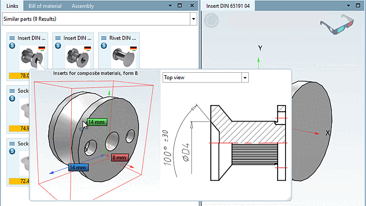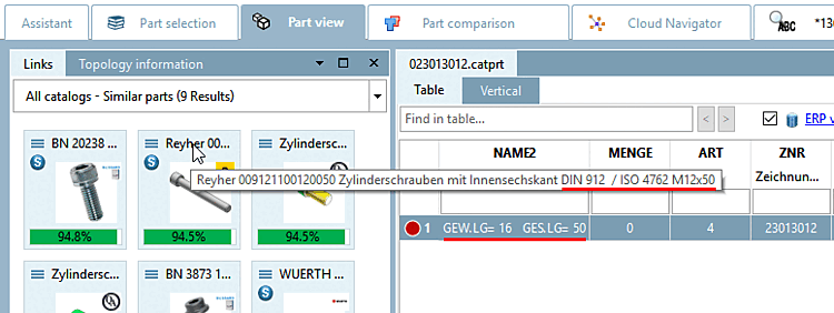 When selecting Similar parts, the so-called bounding box (three-dimensional envelope) is displayed around the part so that you can see at a glance the size ratio between the part currently displayed in the 3D view and the reference part. For larger or smaller reference parts, the bounding box is either outside or inside.