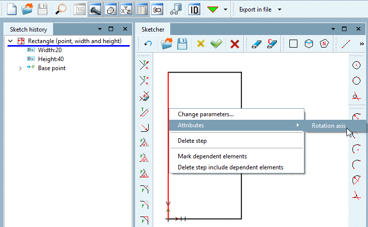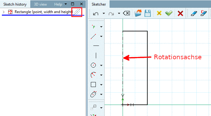 -> The initially red marked line/edge then shows up as dotted line axis and in the Sketch history beside the feature which is containing the rotation axis, a respective icon is displayed.