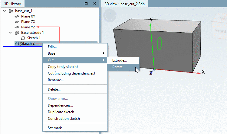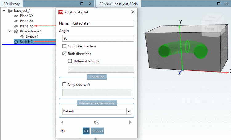 If you want to remove a rotated 2D sketch from a solid, proceed as follows: