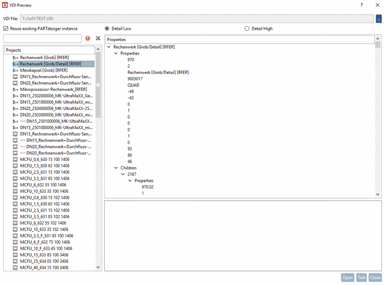 -> The dialog box VDI Preview is opened. Projects which are not available with detail level Detail High are marked crossed out .