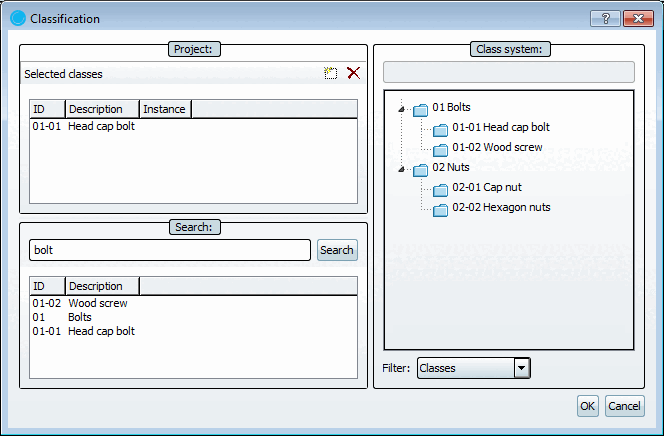 In the exemplary figure now when entering "Schraube" (bolt) all classes, which contain this term, are displayed. If you select a search result, then in the tree the respective class is also selected.