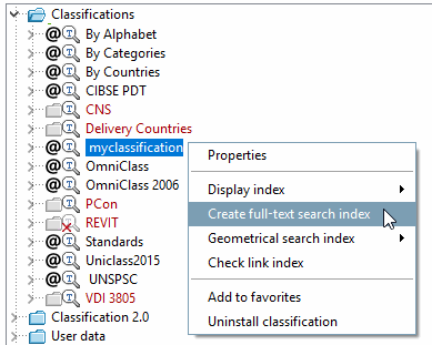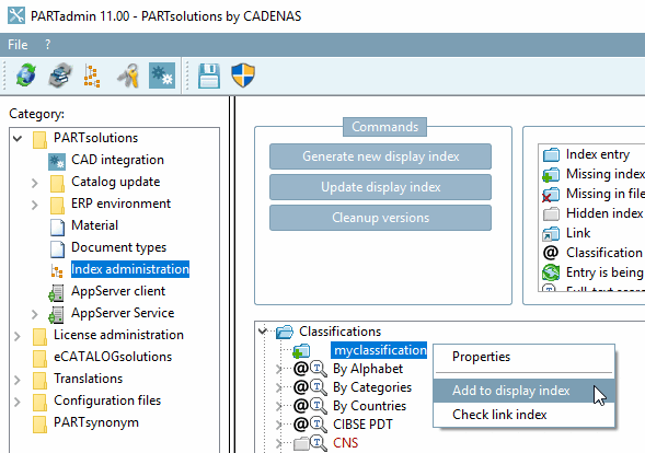 In the directory tree under Classifications, call up the Include in the display index [Add to display index] command in the context menu of the newly created classification. Detailed information on this can be found under Section 1.4.3.6, “ Index administration ” in ENTERPRISE 3Dfindit (Professional) - Administration.