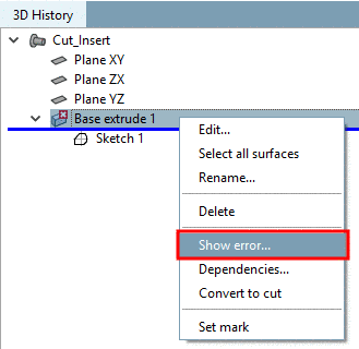 If a sketch feature (design step) is highlighted with a red cross in the 3D History, an error occurred. Then a concrete error message is displayed: